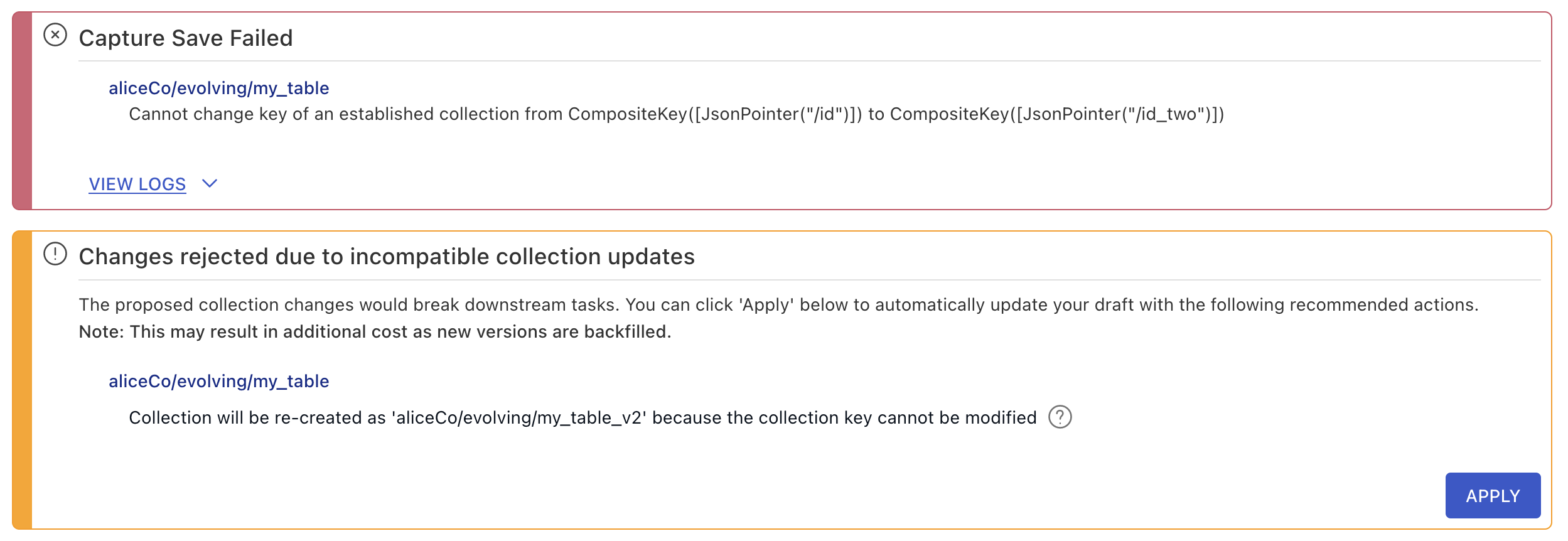 When any of these parts change, any capture or materialization writing to or reading from the collection must be updated to approve of the change, otherwise, the Data Flow will fail with an error.