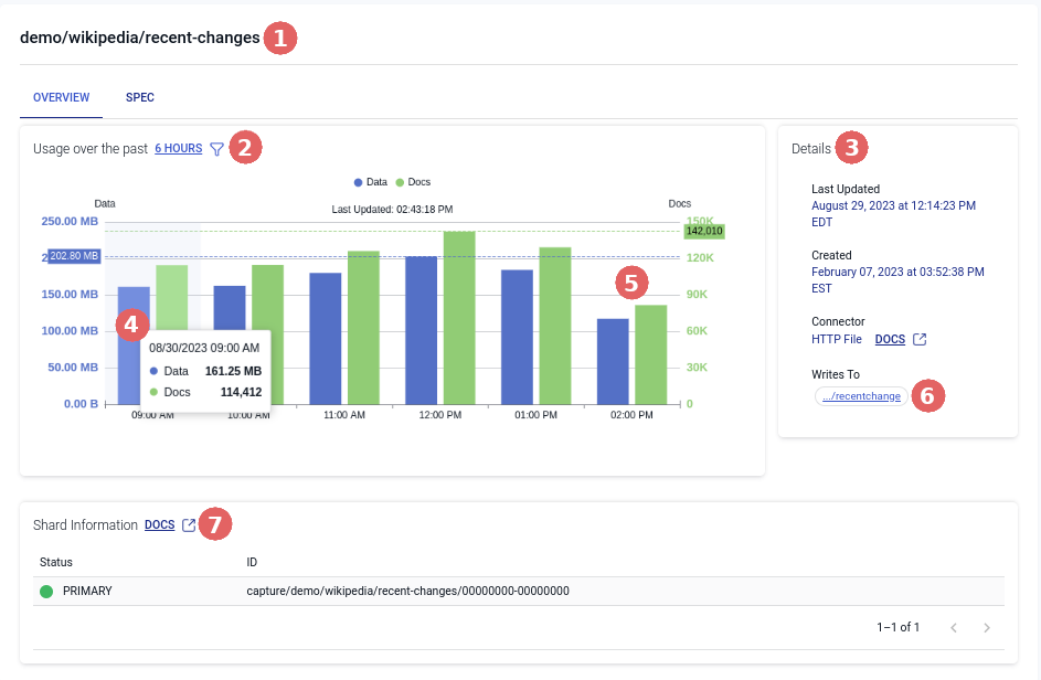 3: The Details section shows different pieces of information about the capture. When it was last updated, when it was created, the connector being used, and the collections to which the capture writes data.