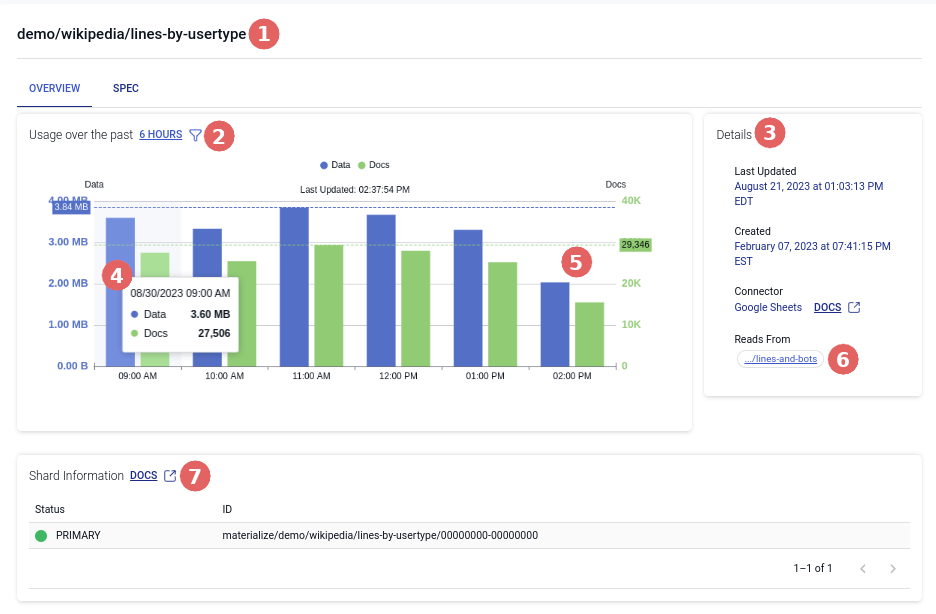 9: Publish time. Hover over this value to see the exact UTC time the materialization was last published.