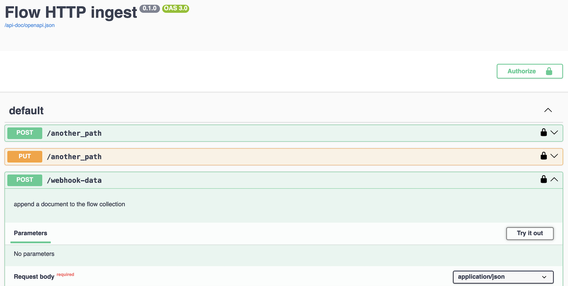 Expand POST or PUT and click Try it out to send some example JSON documents using the UI. You can also copy the provided