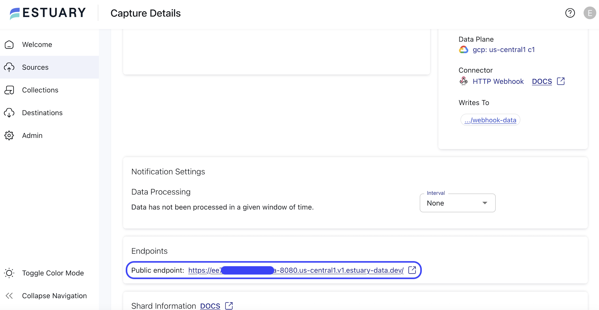 On the Capture Details page, scroll down to the Endpoints section. The listed link will be the base URL for your webhook. This should be something like https://abc123-8080.us-central1.v1.estuary-data.dev.