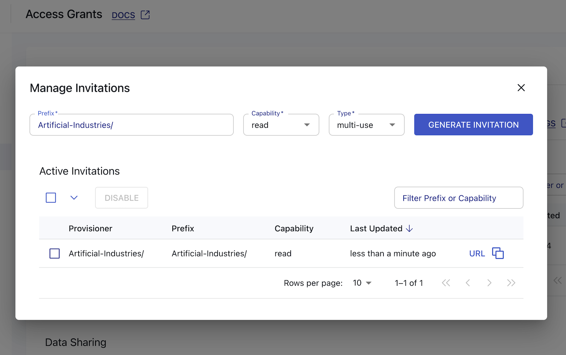 Generating a new invitation will create a URL with a grant token parameter. This token will allow access based on the prefix, capability, and type you select. Copy the URL and share it with its intended recipient to invite them to your organization.