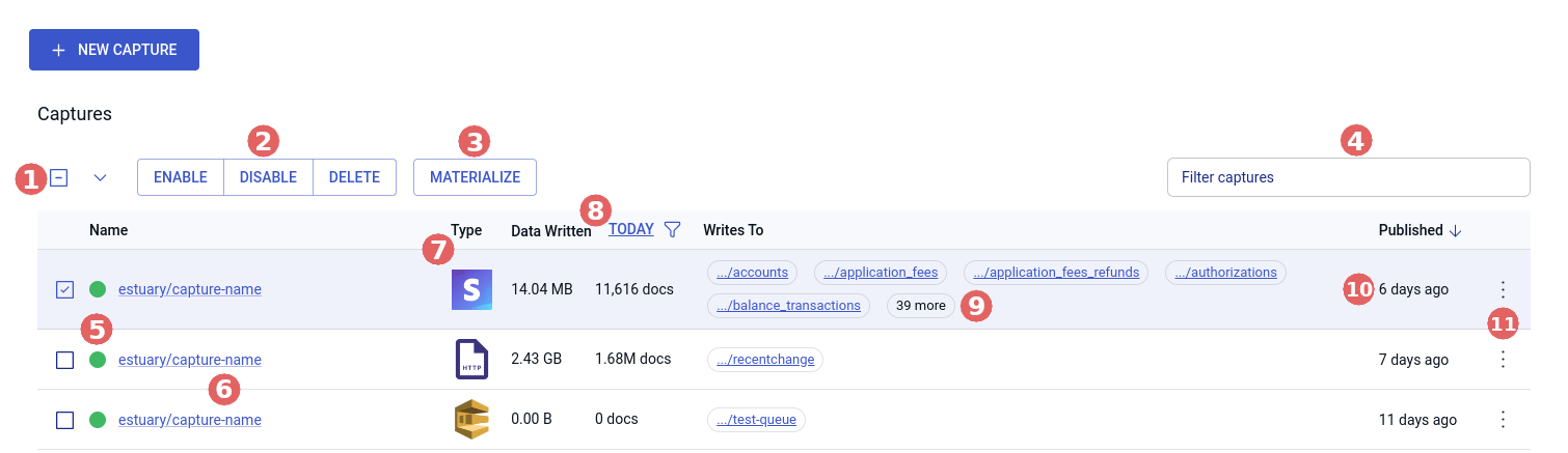 9: Associated collections. The Writes to column shows all the collections to which the capture writes data. For captures with a large number of collections, there is a chip stating how many collections are hidden. Clicking on this will allow you to hover over this column and scroll to view the full list. These also link to the details page of the collection.