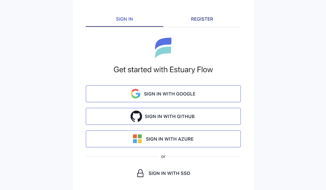 You use a Google, Microsoft, or GitHub account to sign into Estuary. Alternatively, contact us about Single Sign-On (SSO) options.