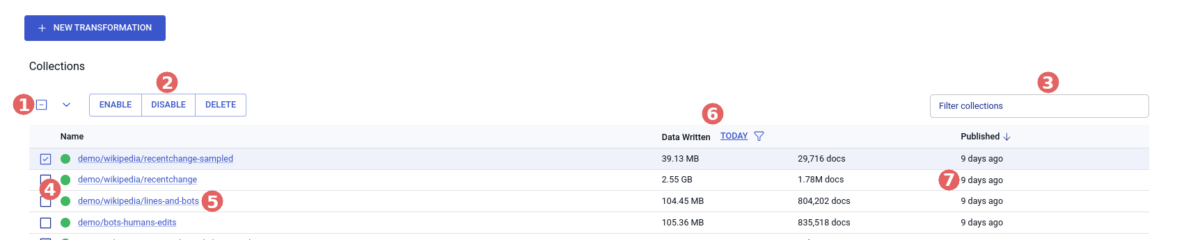 2: Enable, Disable, and Delete buttons. These actions will be applied to the selected table rows. Choose Disable to temporarily pause the flow of data, Enable to resume, and Delete to permanently remove the collection(s).
