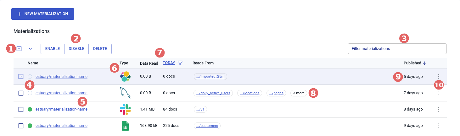 2: Enable, Disable, and Delete buttons. These actions will be applied to the selected table rows. Choose Disable to temporarily pause the flow of data, Enable to resume, and Delete to permanently remove the materialization(s).