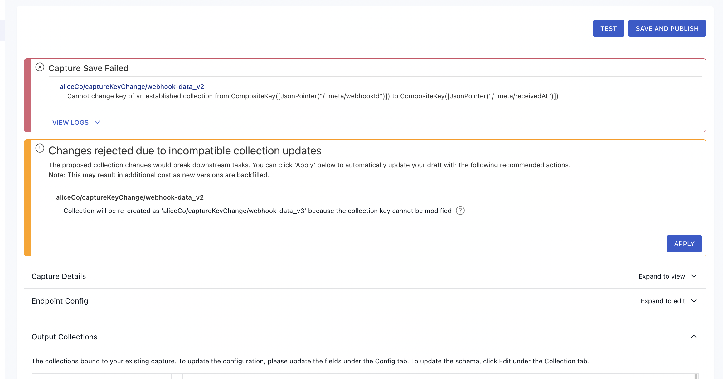There are many reasons a collection spec might change. Often, it's due to a change in the source data. Regardless, you'll need to make changes to downstream tasks — most often, materializations — to avoid errors.