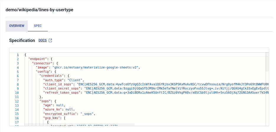 When you click Edit specification for a materialization, you're taken to the Edit Materialization page.